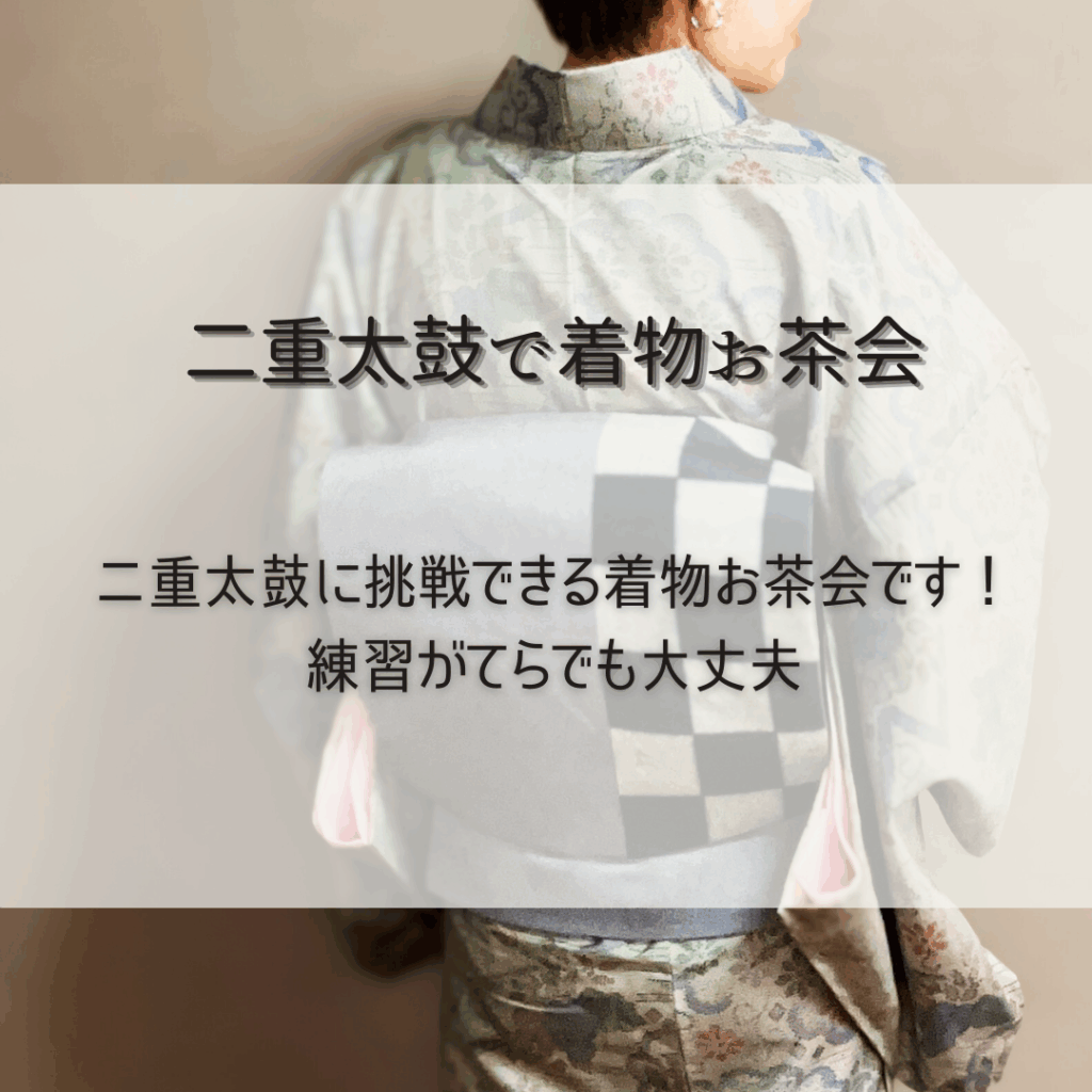 二重太鼓に挑戦できる着物お茶会です。うまく結べなくても大丈夫!練習がてら気軽に楽しめます。まだ結んだことない帯があればぜひ!