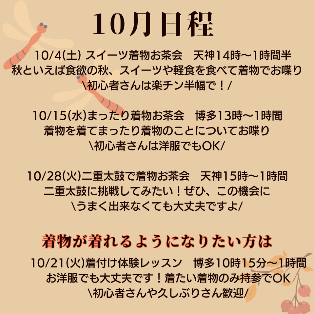 10月は、秋のスイーツを味わう着物お茶会や、着物についてまったり語る会、二重太鼓に挑戦できる会などを予定しています。初心者さんは洋服での参加や、楽ちんな半幅帯からのスタートも大歓迎♬